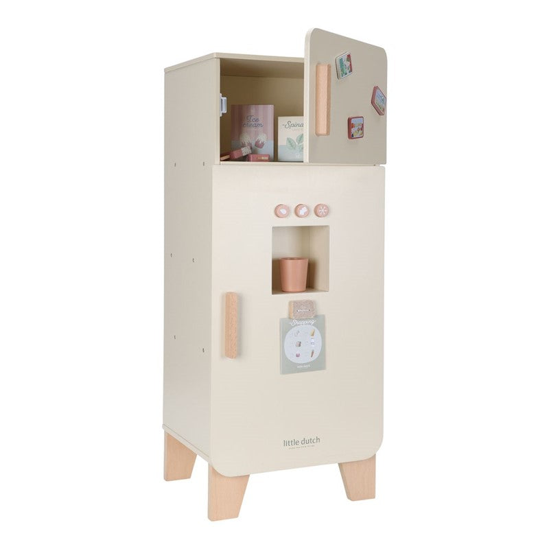 ¡Mantén tus alimentos frescos en esta bonita nevera de madera! La nevera cuenta con un práctico congelador con máquina para hacer cubitos de hielo y amplio espacio para guardar los alimentos de forma ordenada, incluyendo un porta huevos especial. Perfecto para que el juego de simulación en la cocina sea aún más realista. Con esta nevera, los niños se divertirán durante horas mientras aprenden sobre alimentos y su almacenamiento. ¡Un complemento maravilloso para cualquier cocina de juguete!