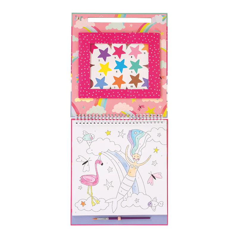 Disfruta de horas de diversión creando obras maestras con el pincel suministrado, paletas de pintura individuales (en forma de fogatas) con colores numerados para que coincidan con las secciones numeradas de las imágenes.