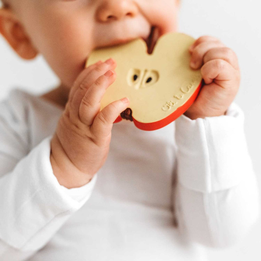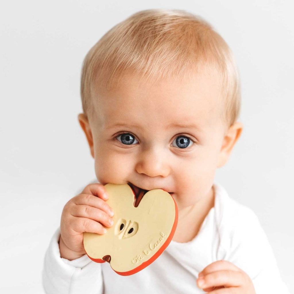Pepita the Apple es un mordedor, juguete de baño y juguete sensorial para bebé. Hecho a mano con caucho 100% natural y pintado a mano con pigmentos alimentarios.